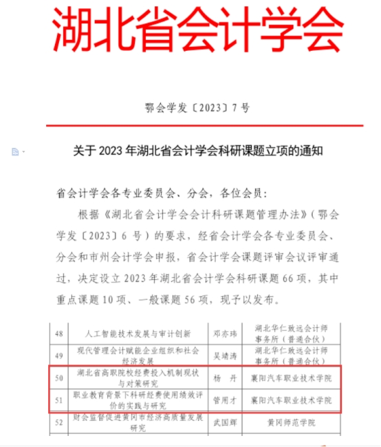 4月28日,湖北省会计学会公示了2023年科研课题立项名单,经学会审查,我校党委员、副校长管用才申报的“职业教育背景下科研经费使用绩效评价的实践与研究”、计财处处长杨丹申报的“湖北省高职院校经费投入机制现状与对策研究”作为研究课题获批立项。此次立项课题共66项,其中,重点课题10项,一般课题56项。