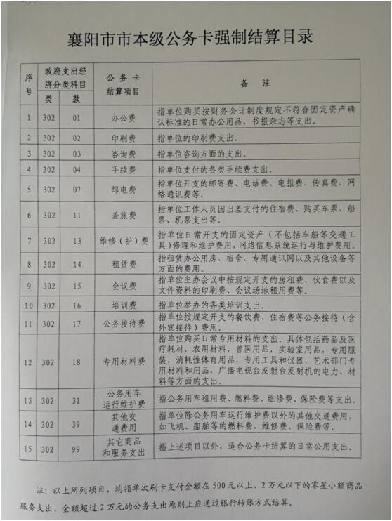 附:襄阳市市本级公务卡强制结算目录图片