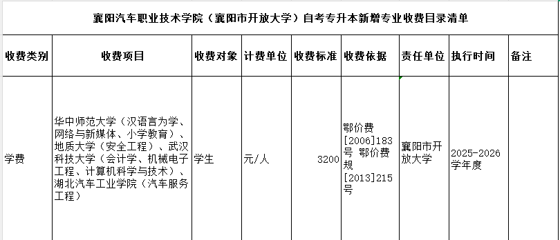 襄阳汽车职业技术学院(襄阳市开放大学)自考专升本新增专业收费目录清单
